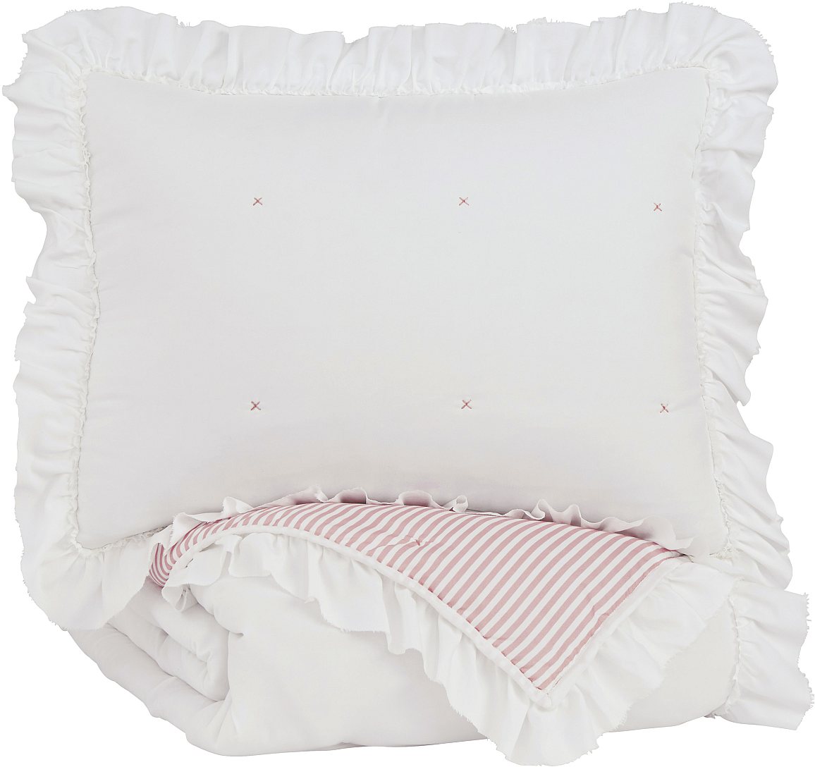 With her favorite colors coming together, this comforter set makes for one sweet dreaming retreat. The crisp clean white comforter with flange border reverses to a light pink and white pinstripe design providing a fresh new look to suit your mood. 3-Piece Comforter Set - Includes Comforter and 2 Shams (1 in Twin). Solid in White with Flange Border. Reverses to Pinstripe Design in Light Pink and White. Polyester Microfiber Cover with Polyester Filling. Machine Washable.