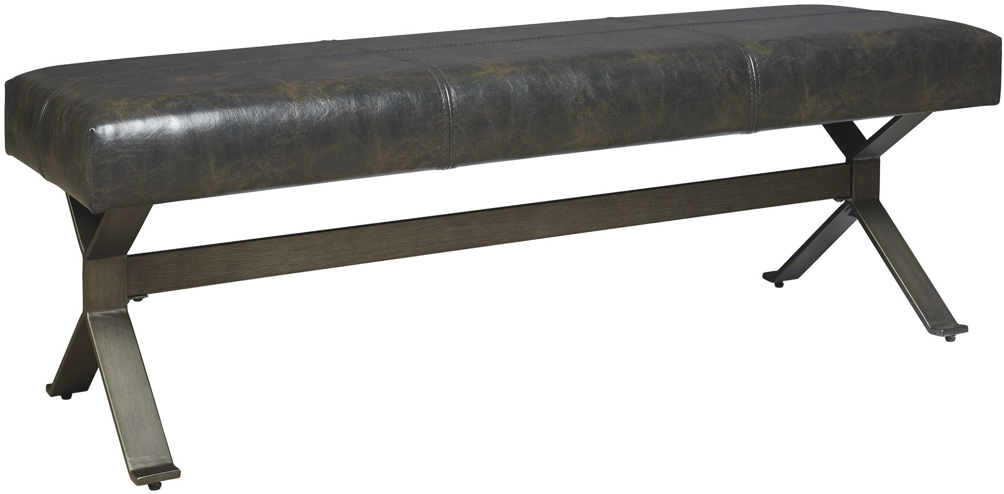 Sit on the sidelines in style with the Lariland accent bench. Black distressed faux leather cushion puts the handsome in comfort. Bronze-tone metal legs support the bench with an “X” design. Place it in an entryway or at the foot of your bed for casual contemporary vibes.