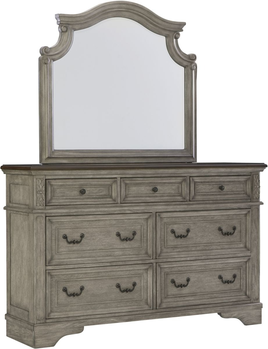 Cottage quaint styling and quality construction make this dresser with mirror a dream come true. A two-tone finish provides rustic warmth, with an antiqued gray body and a rich, deep walnut on the top. The framed drawer fronts, ornately shaped mirror and dark bronze-tone hardware marry classic elegance and homey charm.Read More
