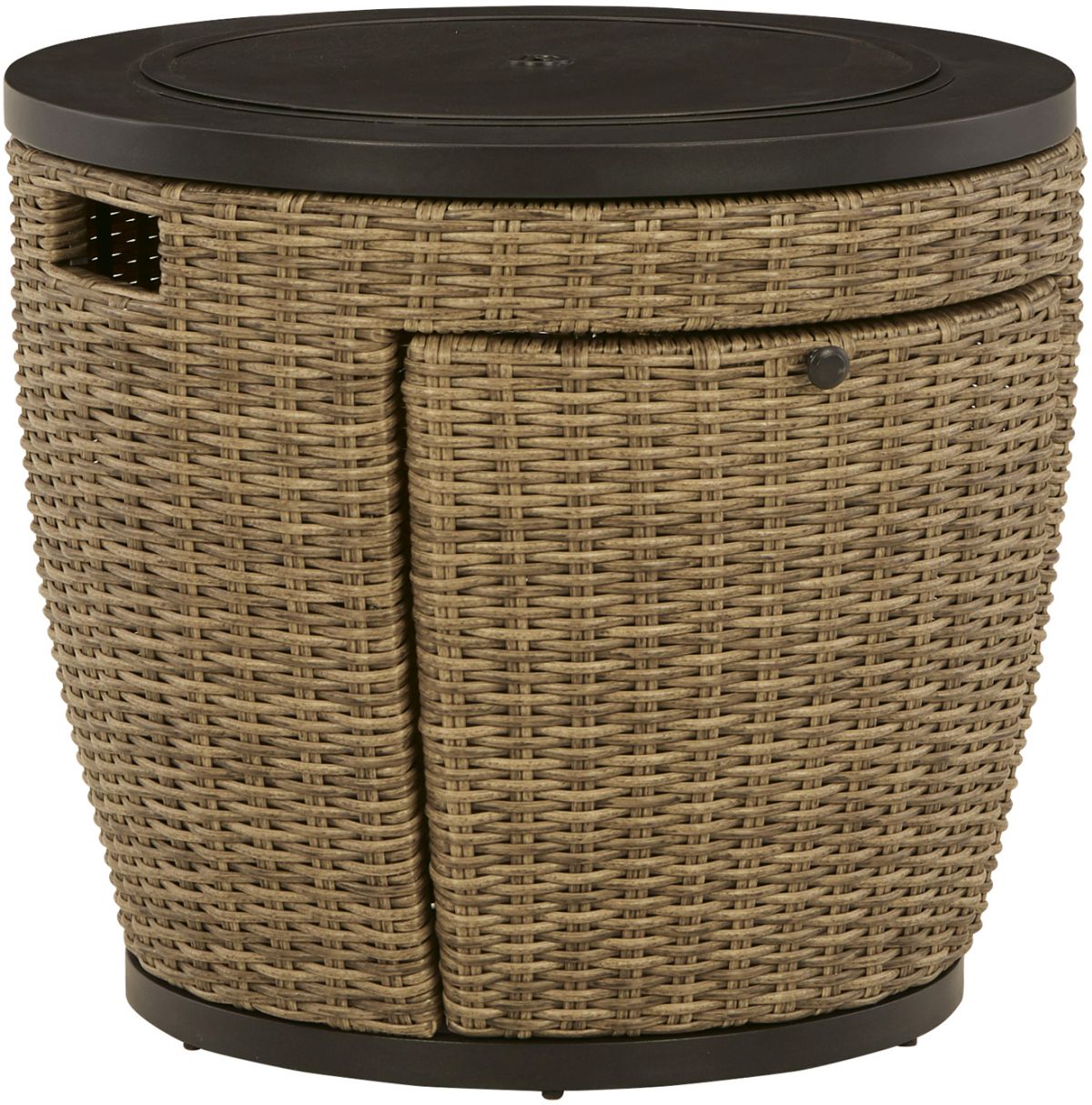 Warm up cool nights with this round fire pit table. Sporting an easy-on-the-eyes look inspired by driftwood, this fire pit table elevates the art of alfresco living. Its chic circular top is paired with all-weather resin wicker over rust-proof aluminum for beauty and brawn. A stainless steel burner with glass beads adds a captivating element sure to wow.Read More