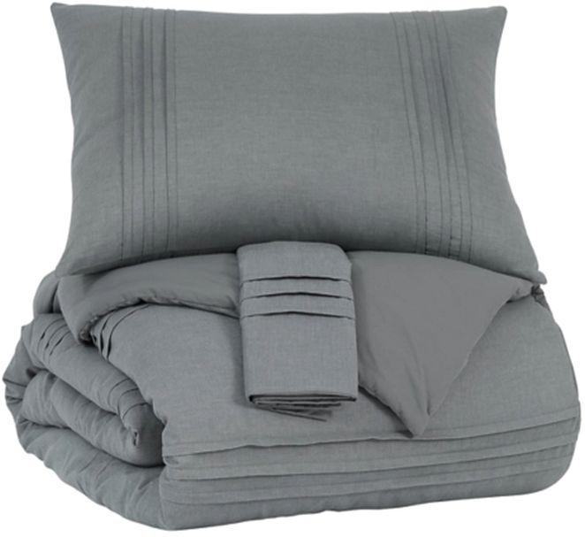 3-piece comforter Set - includes comforter and 2 shams. Chambray woven pleated stripe design in gray. Cotton cover with polyester filling. Machine washable.
