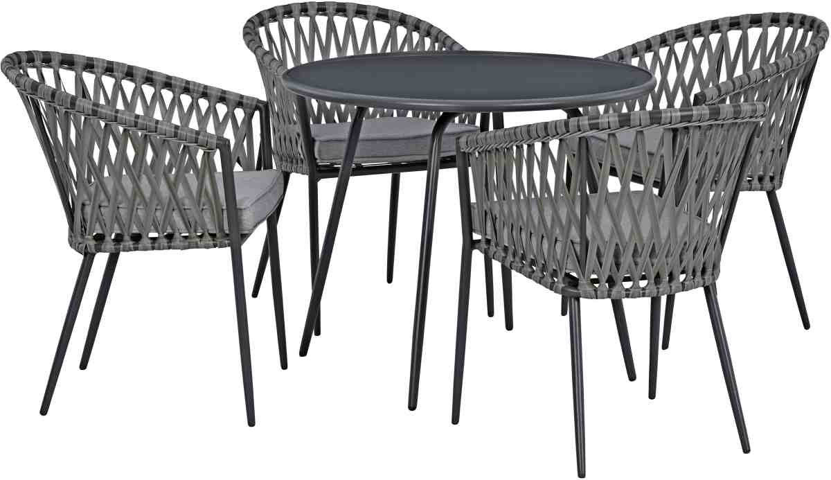 Includes round dining table and four dining chairs