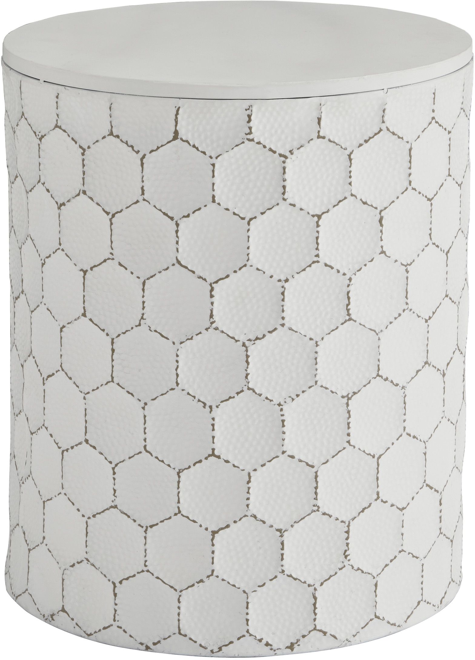Trendsetting and contemporary. Take a fashion risk with this accent stool. Outlined honeycomb design on hammered metal is teeming with texture. Uniquely versatile size lets it serve as an accent table, plant stand or extra seating.Read More