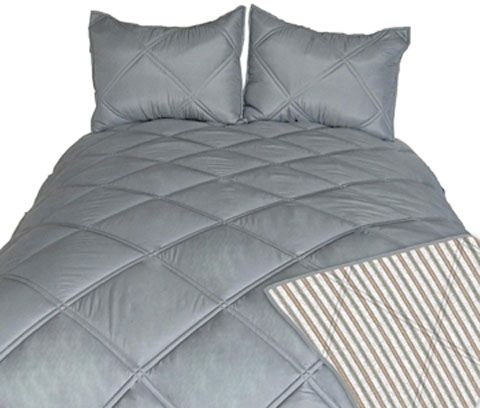 3-Piece Comforter Set - Includes Comforter and 2 Shams (1 in Twin). Striped Design in Tan, Brown and Gray. Reverses to Solid in Gray. Polyester Microfiber Cover with Polyester Filling. Machine Washable.