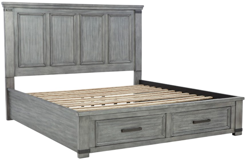 With its light weathered gray coloration, this storage bed conveys trend-right urban farmhouse style. Thick-profiled top molding on the tall, mansion-scale headboard lends a fresh take on a timeless design. The footboard features two storage drawers with profiled frames and dovetail construction.Read More