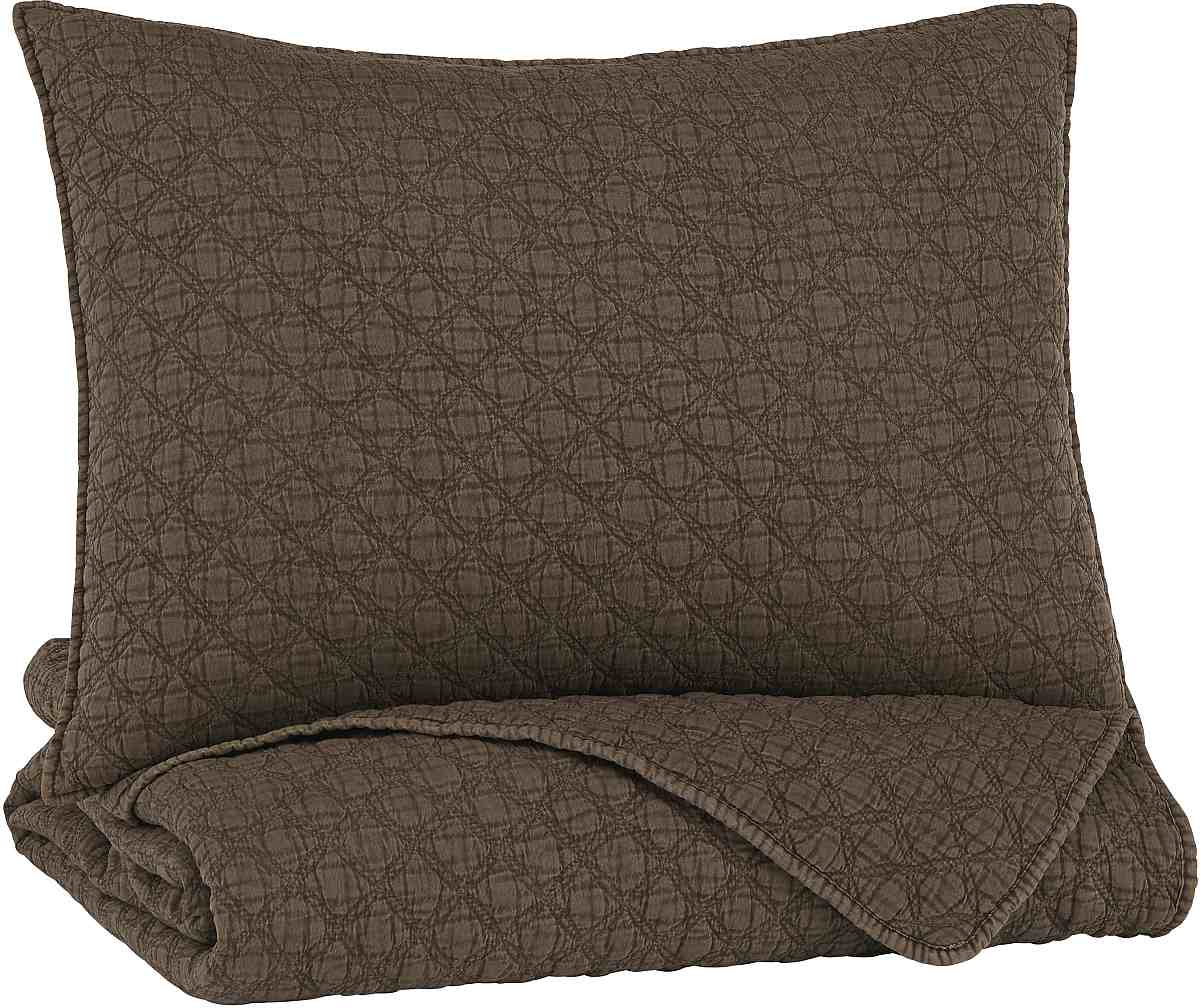 3-Piece Coverlet Set - Includes Coverlet and 2 Shams. Quilted Diamond Design in a Brown Stonewash. Polyester Microfiber Cover with Polyester Filling. Machine Washable. Due to the finishing process of this product, some variations may occur.