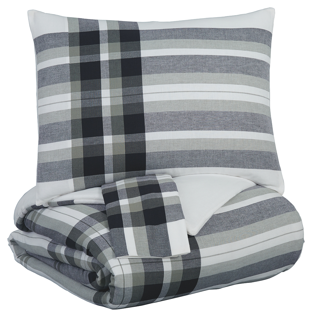 3-Piece Comforter Set - Includes Comforter and 2 Shams. Large Plaid Design in Black, Gray and White. Cotton Cover with Polyester Filling. Machine Washable.