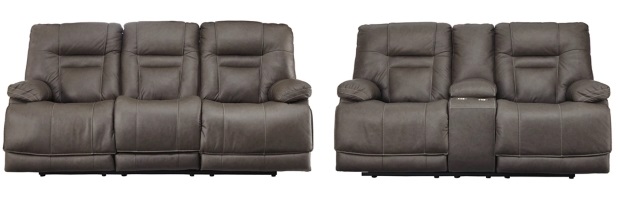 Includes power reclining sofa and power reclining loveseat with console