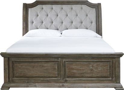Inspired by heavy and hearty lodge-style furnishings from days gone by, this luxurious upholstered panel bed brings the past brilliantly into the present. Distinctive details include an upholstered headboard with button-tufted details, raised panel footboard and an aged pine color finish with light wire-brushed texture that’s pure artistry.Read More