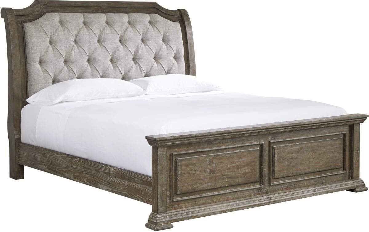 Inspired by heavy and hearty lodge-style furnishings from days gone by, this luxurious upholstered panel bed brings the past brilliantly into the present. Distinctive details include an upholstered headboard with button-tufted details, raised panel footboard and an aged pine color finish with light wire-brushed texture that’s pure artistry.Read More